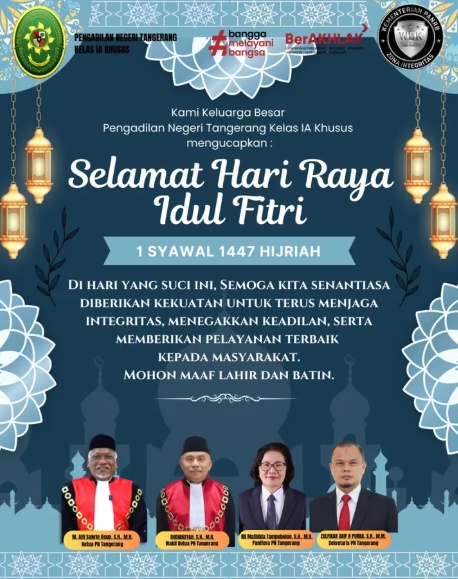Pengadilan Negeri Tangerang Kelas IA Khusus mengucapkan Selamat Hari Raya Idul Fitri 1 Syawal 1447 H.