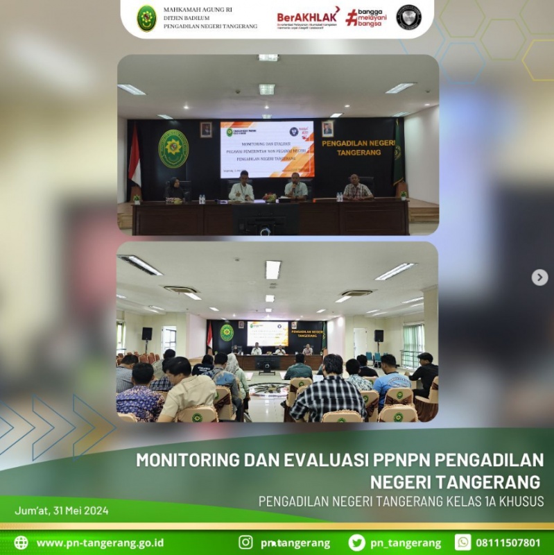 Sehubungan dengan hasil Rapat Kesekretariatan pada tanggal 7 Mei 2024, agar dilakukan Monitoring dan Evaluasi Bulan Mei 2024 terhadap Pegawai Pemerintah Non Pegawai Negeri pada PN Tangerang. Maka, Hari ini Jumat 31 Mei 2024 dilaksanakan Rapat tersebut, bertempat di Ruang Aula Lantai 5 PN Tangerang, Pukul 09.30 s.d Selesai. Rapat yang dipimpin oleh Sekretaris PN Tangerang, Bapak H. Zulfikar Arif Rahman Purba, S.H., M.M., didampingi oleh Seluruh Kepala Subbagian, dan diikuti PPNPN PN Tangerang.