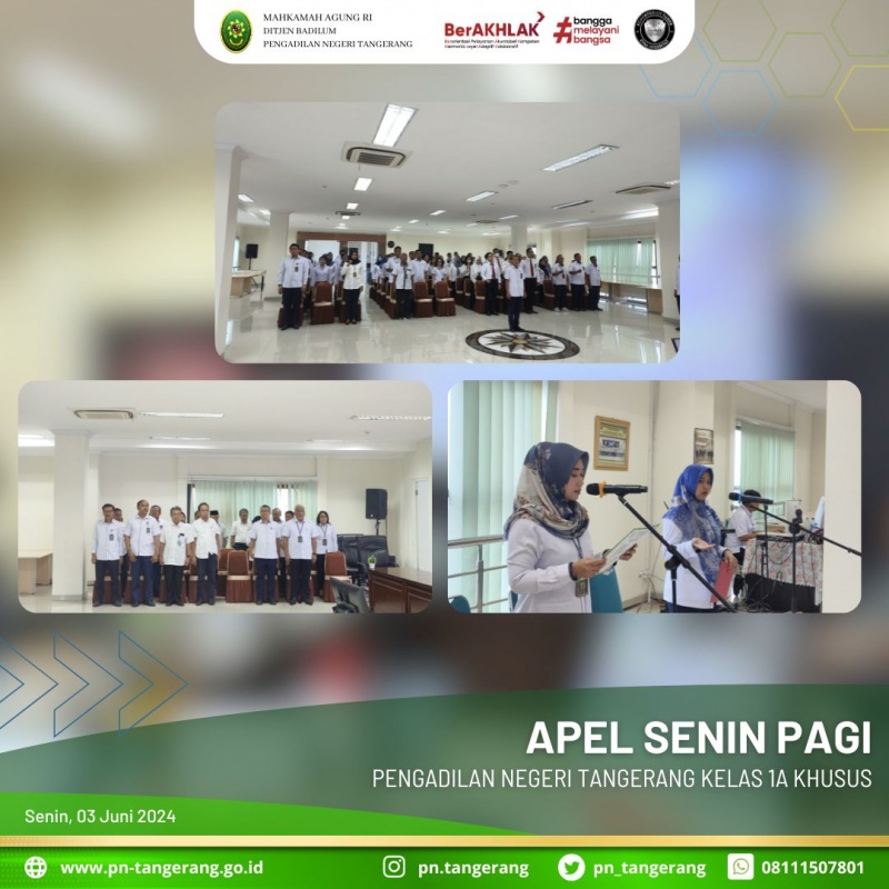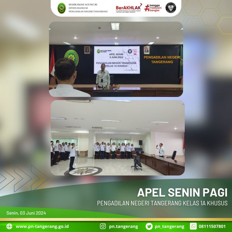 Apel rutin Senin pagi pukul 08.00 WIB bertempat di ruang Aula Lt.5 Pengadilan Negeri Tangerang. Apel pagi merupakan sebuah tindak lanjut dari upaya penegakan disiplin kerja Aparatur Sipil Negara (ASN), khususnya Pegawai di Pengadilan Negeri Tangerang. selain untuk mendengarkan arahan pimpinan, Apel pagi juga bermanfaat untuk melatih disiplin dan tanggung jawab serta evaluasi kegiatan yg berjalan maka dari itu Pengadilan Negeri Tangerang rutin dilaksanakan yang diikuti oleh Bapak/Ibu Hakim, Panitera, Sekretaris, Para Pejabat Setruktural/Fungsional, serta diikuti oleh Karyawan/Karyawati ASN, Tenaga Honorer, dan Tenaga Kerja Kontrak pada Pengadilan Negeri Tangerang