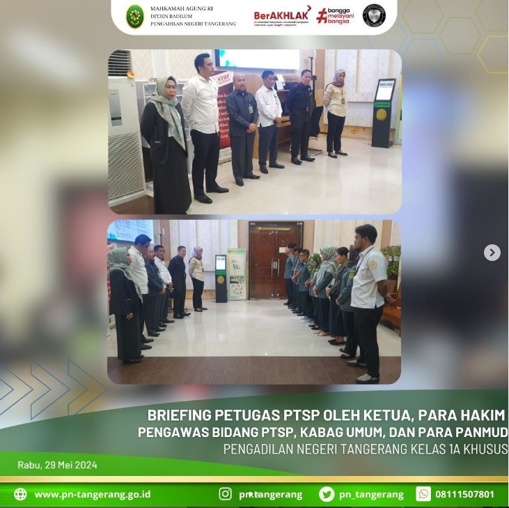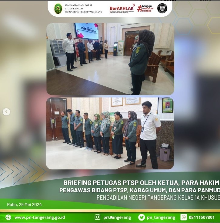 Rabu, 29 Mei 2024, bertempat di Ruang PTSP Lt.Dasar Pengadilan Negeri Tangerang, Ketua Dr. Fahmiron, S.H.,M.Hum., selaku Pembina, memimpin Briefing serta Memonitoring dan Evaluasi kinerja Para Petugas PTSP, didampingi oleh Hakim Pengawas Bidang PTSP, Kabag Umum, dan Para Panmud, serta diikuti oleh seluruh Petugas PTSP Pengadilan Negeri Tangerang Kelas IA Khusus