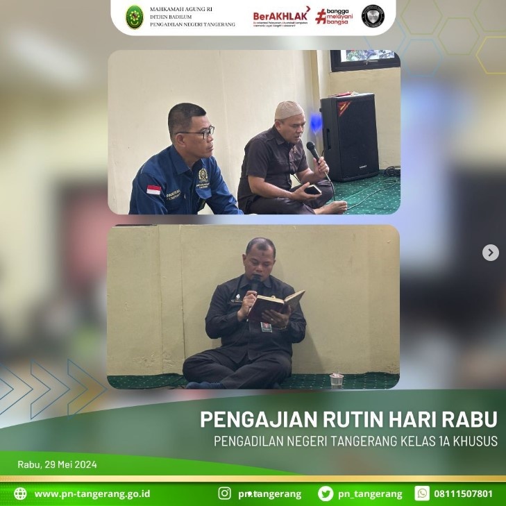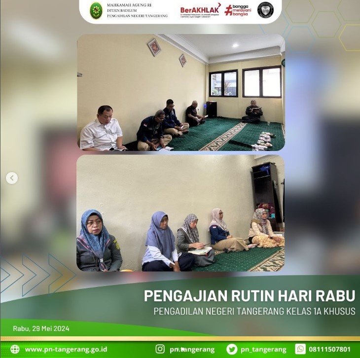 Bertempat di Mushola Ar-Rahman PN Iconwin Tangerang, Pukul 08.15 WIB, diadakan Pengajian Rutin bagi segenap muslimin dan muslimah di lingkungan PN Tangerang agar memperkuat keimanan dan menambah ilmu agama. Pembacaan Surat Yaasin dipimpin oleh Bapak H. Zulfikar Arif Rahman Purba, S.H., M.M. dan tausiyah disampaikan oleh Bapak H. Masduki, S.H. Kegiatan tersebut dihadiri oleh Bapak/Ibu Hakim, Pejabat Struktural/Fungsional, dan Staff ASN pada Pengadilan Negeri Tangerang.