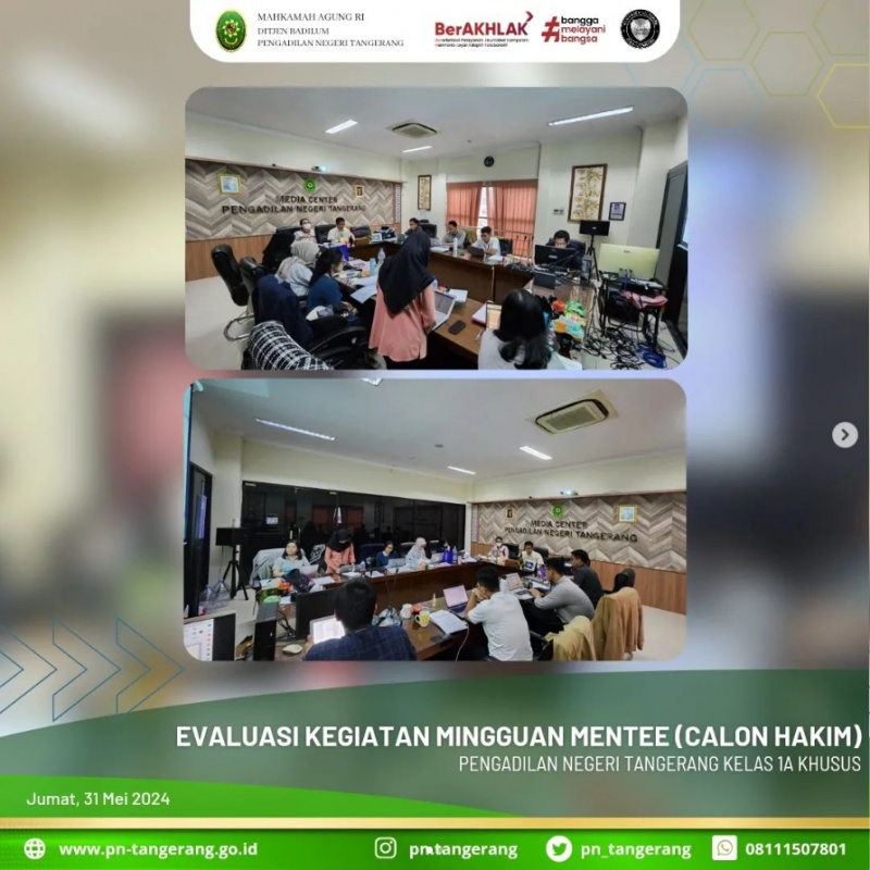 Pada hari ini Jum’at tanggal 31 Mei pukul 13.30 WIB s.d 16.00 WIB bertempat di Ruang Media Center Kesekretariatan Lantai 5 Pengadilan Negeri Tangerang dilaksanakan Evaluasi Kegiatan Mingguan Mentee. Masing-masing Mentee memaparkan kegiatan mingguan mereka dihadapan Para Mentor Hakim yaitu Ibu Novita Riama, S.H,, M.H, dan Bapak Kony Hartanto, S.H,, dan dilanjutkan dengan sesi diskusi dan tanya jawab. Pada periode minggu ini, Mentee masih melanjutkan kegiatan di bagian kepaniteraan yaitu pada Bagian Panitera Pengganti. Para Mentee diberikan waktu untuk mempresentasikan kegiatan magangnya kemudian hal-hal yang dipresentasikan tersebut ditanggapi oleh Para Mentor dan didiskusikan dengan para Mentee. (lsl).