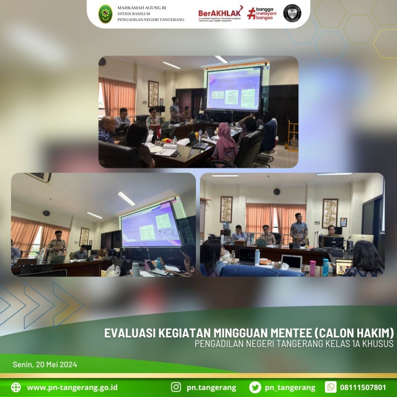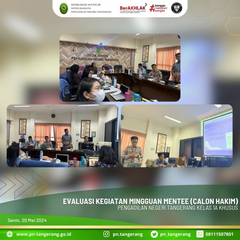 Pada hari ini Jum’at tanggal 17 Mei pukul 13.30 WIB s.d 16.00 WIB bertempat di Ruang Media Center Kesekretariatan Lantai 5 Pengadilan Negeri Tangerang dilaksanakan Evaluasi Kegiatan Mingguan Mentee. Masing-masing Mentee memaparkan kegiatan mingguan mereka dihadapan Para Mentor Hakim yaitu Bapak. Achmad Irfir Rochman , S.H,, M.H,, Ibu Novita Riama, S.H,, M.H, Bapak Kony Hartanto, S.H,, dan dilanjutkan dengan sesi diskusi dan tanya jawab. Pada periode minggu ini, Mentee dibagi melaksanakan kegiatan di bagian kepaniteraan yaitu pada Bagian Kepaniteraan Pidana. Para Mentee diberikan waktu untuk mempresentasikan kegiatan magangnya kemudian hal-hal yang dipresentasikan tersebut ditanggapi oleh Para Mentor dan didiskusikan dengan para Mentee. (lsl).
