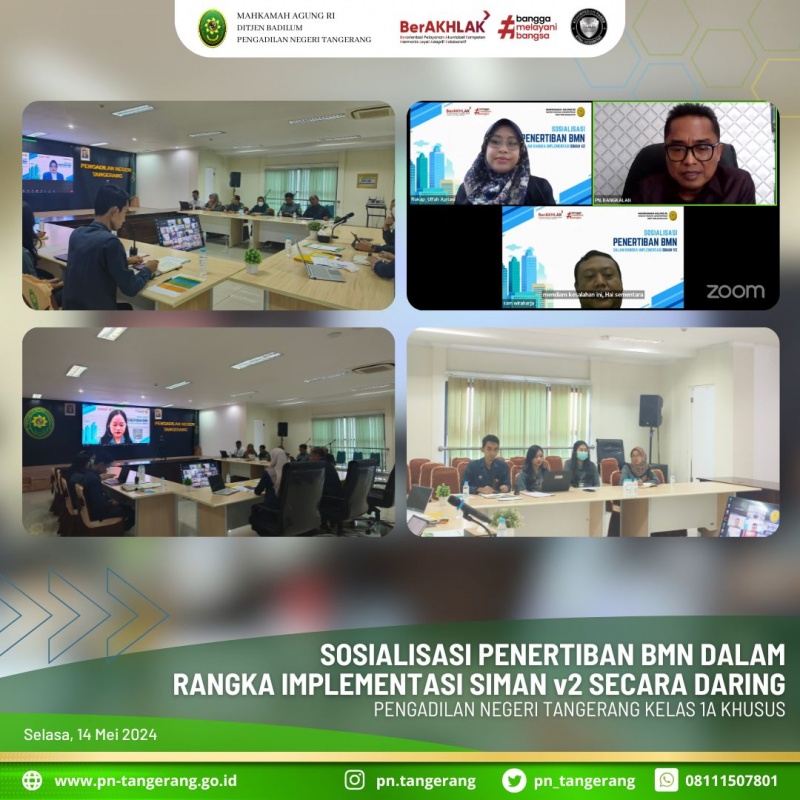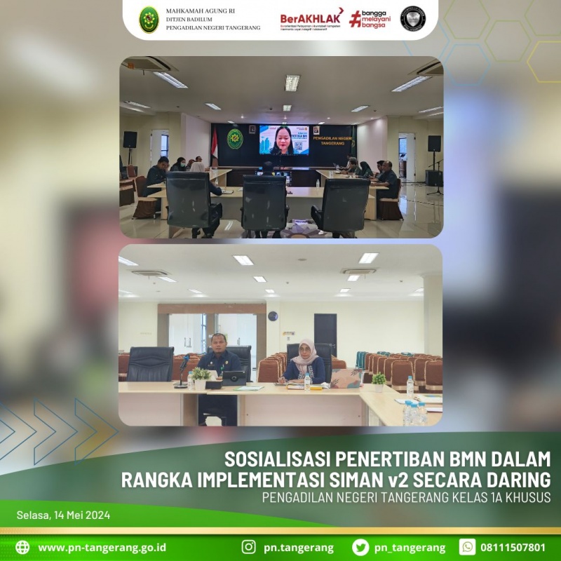 Sehubungan dengan Surat Plt. Sekretaris Mahkamah Agung RI Nomor 119/SEK/PL1.2/V/2024 tanggal 3 Mei 2024 perihal Persiapan Migrasi Data Pengelolaan Barang Milik Negara (BMN) dalam Rangka Implementasi SIMAN v2, bersama ini disampaikan bahwa perlu diadakan sosialisasi Petunjuk Teknis Penertiban Barang Milik Negara (BMN), acara tersebut dilaksanakan Hari Selasa, 14 Mei 2024 secara daring Mulai Pukul 09.00 s.d. selesai.