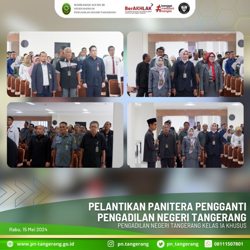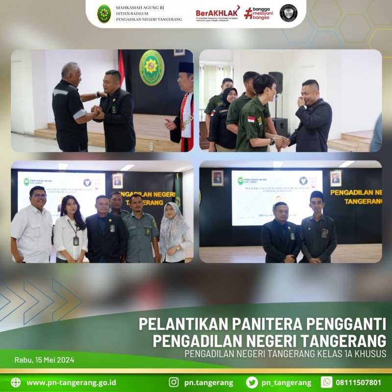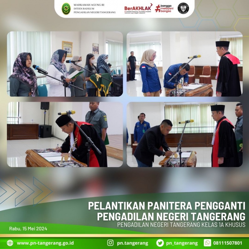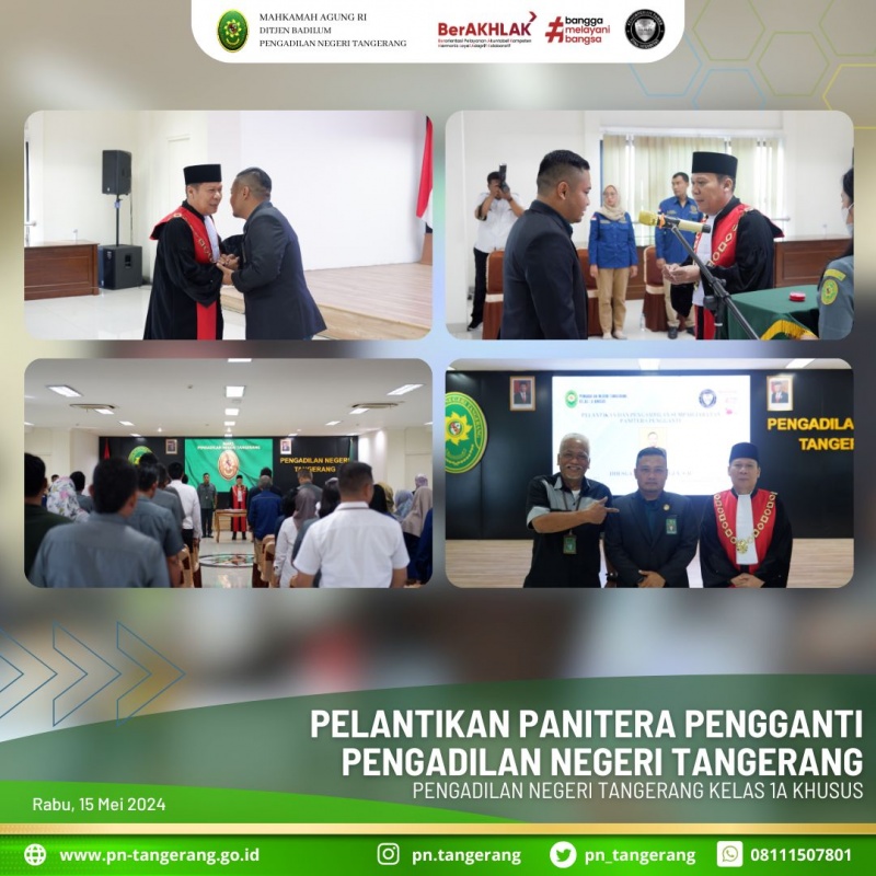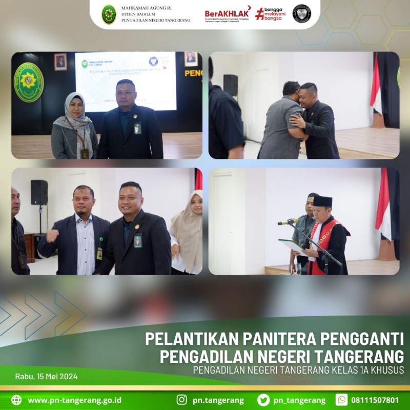 Rabu tanggal 15 Mei 2024, jam 09.00 s/d selesai, bertempat di Ruang aula Pengadilan Negeri Tangerang diselenggarakan acara Pelantikan dan Pengambilan Sumpah Jabatan Panitera Pengganti Pengadilan Negeri Tangerang. Pada acara tersebut Bapak Dr. Fahmiron S.H., M.Hum., selaku Ketua Pengadilan Negeri Tangerang melantik dan mengambil sumpah jabatan a.n. Dhesga Selano Margen, S.H sebagai panitera pengganti pada Pengadilan Negeri Tangerang. Acara tersebut dihadiri oleh Wakil Ketua PN Tangerang Bapak Muhammad Alfi Sahrin Usup, S.H., M.H., Bapak/Ibu Hakim, Bapak Sekretaris, Ibu Panitera, para pejabat struktural/fungsional, Para Cakim dan seluruh pegawai pada PN Tangerang.