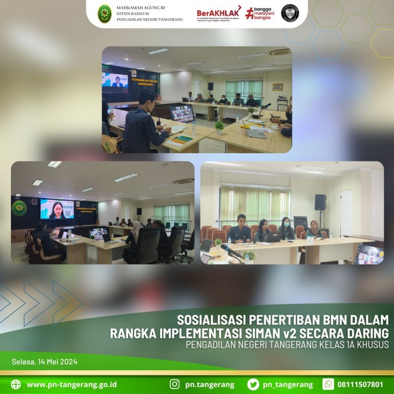 Sehubungan dengan Surat Plt. Sekretaris Mahkamah Agung RI Nomor 119/SEK/PL1.2/V/2024 tanggal 3 Mei 2024 perihal Persiapan Migrasi Data Pengelolaan Barang Milik Negara (BMN) dalam Rangka Implementasi SIMAN v2, bersama ini disampaikan bahwa perlu diadakan sosialisasi Petunjuk Teknis Penertiban Barang Milik Negara (BMN), acara tersebut dilaksanakan Hari Selasa, 14 Mei 2024 secara daring Mulai Pukul 09.00 s.d. selesai.