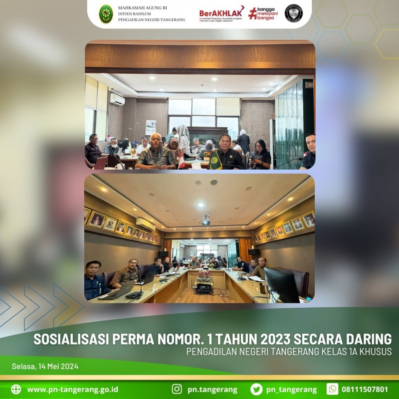 Bertempat di Aula Lantai Pengadilan Negeri Tangerang, Ketua PN Tangerang Bapak Dr. Fahmiron S.H., M.Hum,. didampingi Wakil Ketua PN Tangerang Bapak Muhammad Alfi Sahrin Usup, S.H., M.H., serta seluruh Bapak/Ibu Hakim Pengadilan Negeri Tangerang, mengikuti sosialisasi PERMA Nomor 1 Tahun 2023 Tentang Pedoman Mengadili Perkara Lingkungan Hidup oleh Mahkamah Agung R.I. Secara daring dengan dukungan penyelenggaraan dari Indonesian Center for Environmental Law (ICEL) Berdasarkan Surat Undangan Nomor. 95/DJU/UND.HK1.2.1/V/2024. Sosialisasi ini dilaksanakan selama dua hari yaitu Senin, 13 Mei dan Selasa, 14 Mei 2024.