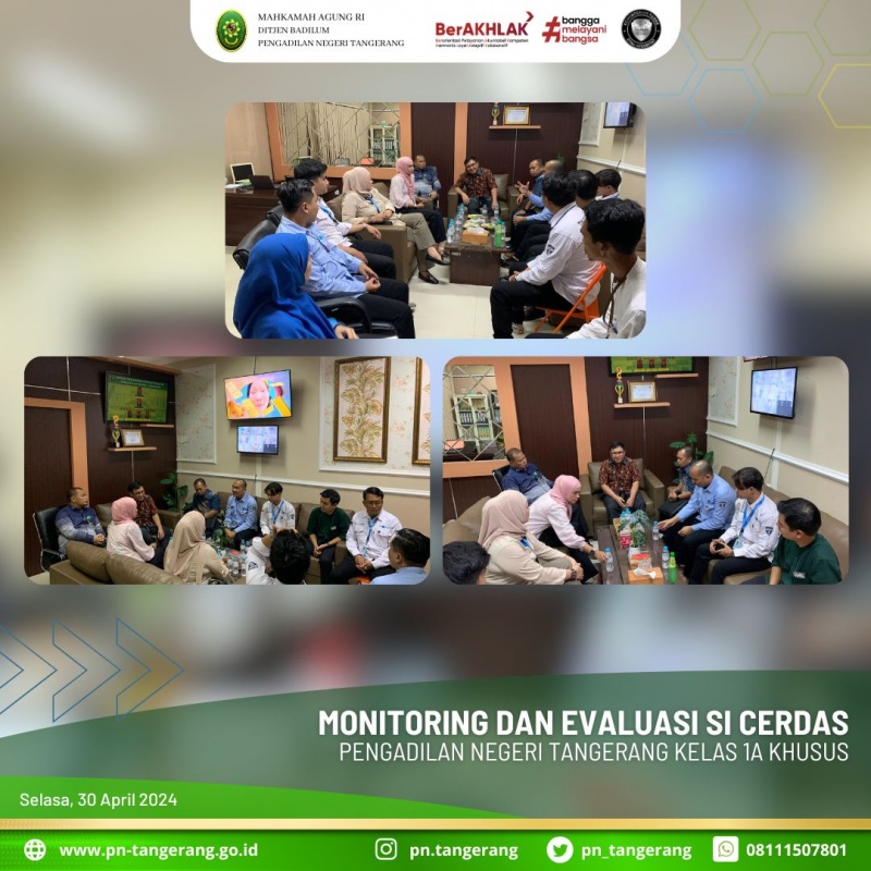 Pada hari ini, bertempat di ruangan Sekretaris Pengadilan Negeri Tangerang Kelas 1A Khusus, pukul 10.00-12.00, diadakan Monitoring dan Evaluasi Aplikasi Si Cerdas. Kegiatan ini dihadiri oleh Bapak Rama Rahim dan Bapak Syafar dari Biro Keuangan Mahkamah Agung RI, keduanya disambut langsung oleh Sekretaris Pengadilan Negeri Tangerang Bapak H. Zulfikar Arif Rahman Purba, S.H., M.M., dan didampingi Kepala Bagian Umum, dan Kepala Sub Bagian Umum. Turut hadir pula perwakilan PT. Mega Rizki Perdana selaku pengelola aplikasi Si Cerdas.