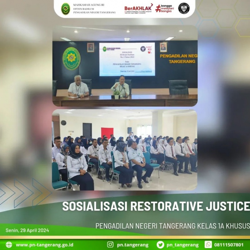 Sosialisasi Restorative Justice yang disertai dengan Diskusi Reguler Restorative Justice oleh Para Hakim pada Pengadilan Negeri Tangerang dilaksanakan pada Hari Senin, 29 April 2024, bertempat di Ruang Aula Lantai 5, pukul 09.00 s.d. selesai. Sosialisasi ini dipimpin oleh Ketua Bapak. Dr. Fahmiron, S.H., M.Hum., dan didampingi oleh Wakil Ketua, Bapak Muhammad Alfi Sahrin Usup, S.H., M.H., serta dihadiri Para Bapak/Ibu hakim, Para Panitera Muda, Para Panitera Pengganti, serta seluruh staff Pengadilan Negeri Tangerang.