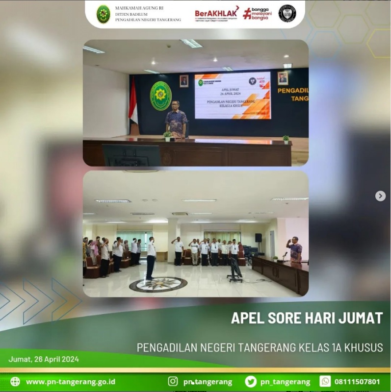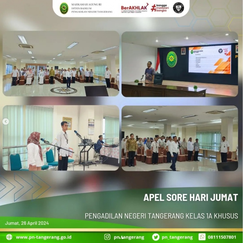 Bertempat di ruang aula lantai 5 dilaksanakan apel sore, Kali ini Bapak Subchi Eko S.H., bertindak sebagai pembina apel. Apel sore ini diikuti oleh Seluruh pegawai Pengadilan Negeri Tangerang.