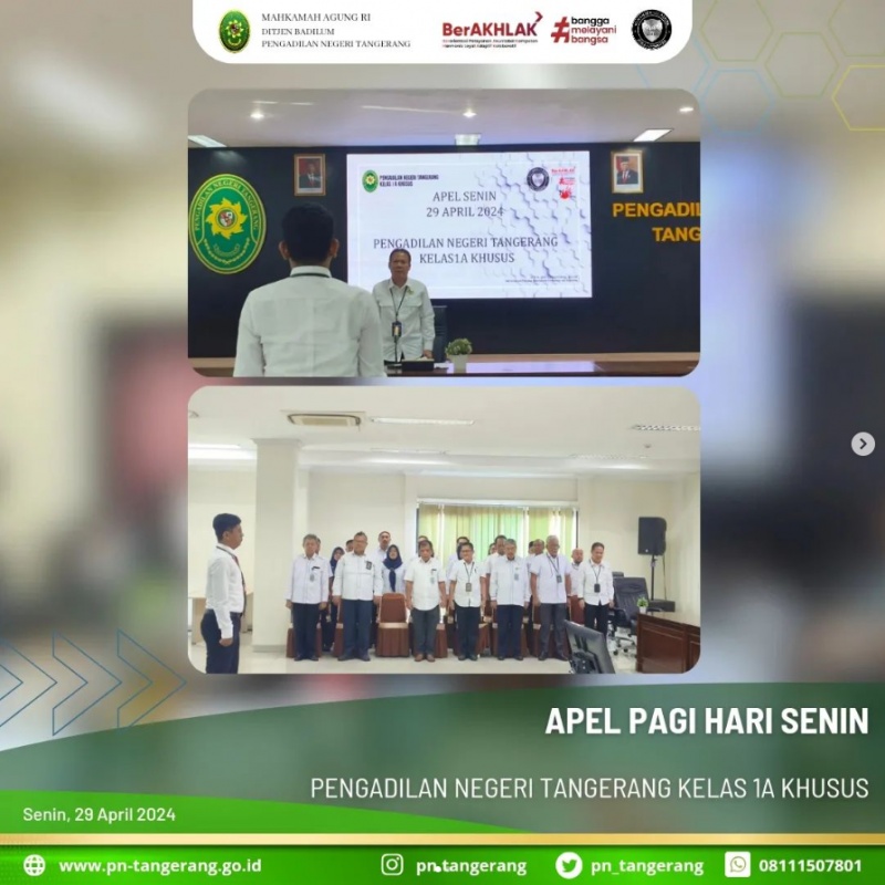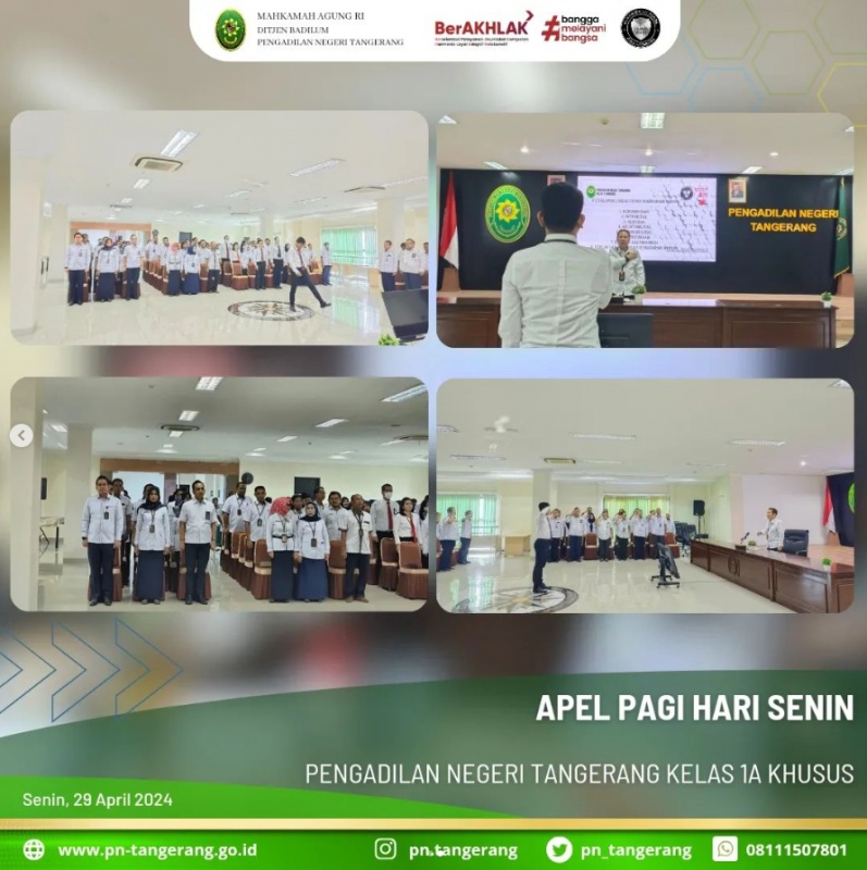 Bertempat di ruang aula lantai 5 dilaksanakan apel pagi hari Senin. Ketua PN Tangerang Bapak Dr. Fahmiron, S.H., M.Hum., bertindak sebagai pembina apel. Apel pagi ini diikuti oleh Wakil Ketua, Seluruh Bapak/Ibu Hakim, Panitera, seluruh pegawai struktural/fungsional, serta seluruh pegawai Pengadilan Negeri Tangerang.