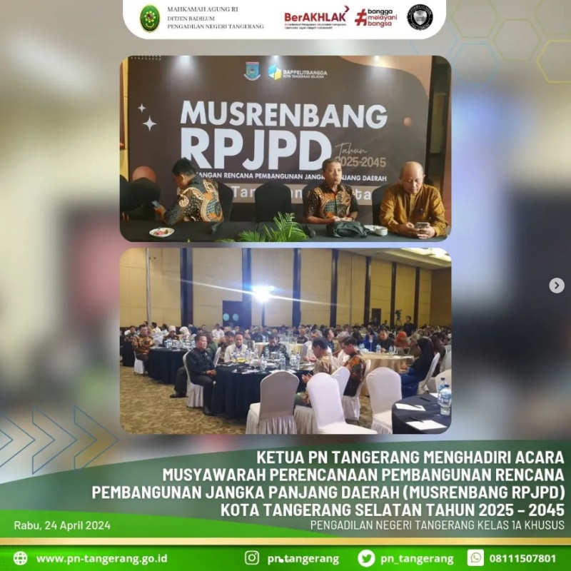 Ketua Pengadilan Negeri Tangerang Bapak. Dr. Fahmiron, S.H., M.Hum., Menghadiri Acara Musyawarah Perencanaan Pembangunan Rencana Pembangunan Jangka Panjang Daerah (Musrenbang RPJPD) Kota Tangerang selatan Tahun 2025 – 2045, bertempat di Ballroom d'primahotel Tangerang, pukul 12.30 s.d 16.00 WIB.