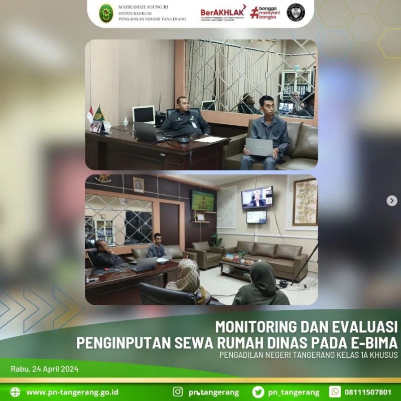 Sekretaris PN.Tangerang Bapak. H. Zulfikar Arif Rahman Purba, S.H., M.Hum., menghadiri Rapat Monitoring dan Evaluasi Penginputan Sewa Rumah Dinas pada E-BIMA melalui Zoom Meeting pukul 13.30 WIB, bertempat diruang sekretaris dan didampingi oleh Kepala Bagian Umum Dessy Herliani, S.Sos., dan juga diikuti oleh staff PTIP, TUK PN Tangerang.