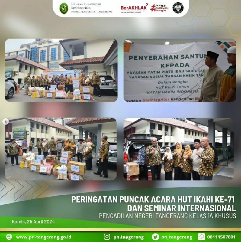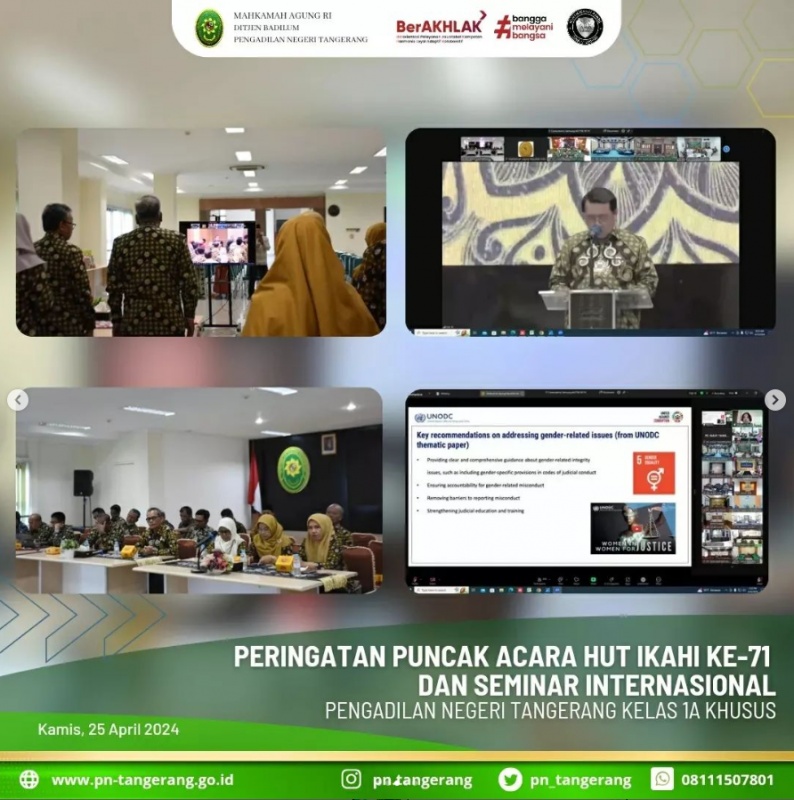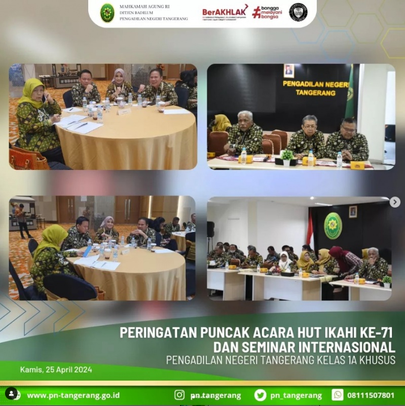 Dalam rangka puncak acara Hut Ikatan Hakim Indonesia (IKAHI) Ke-71 dengan tema “Hakim Berintegritas Peradilan Bermartabat” yang diselenggarakan di Hotel Grand Mercure Kemayoran Jakarta, Ketua Pengadilan Negeri Tangerang Kelas 1A Khusus Bapak Dr. Fahmiron S.H., M.Hum,. menghadiri dan mengikuti rangkaian acara secara langsung, selain acara puncak peringatan HUT IKAHI juga diadakan seminar internasional secara hybrid dengan topik “Integritas dan Kesejahteraan Hakim : Tren dan Komparasi Dari Berbagai Negara”.