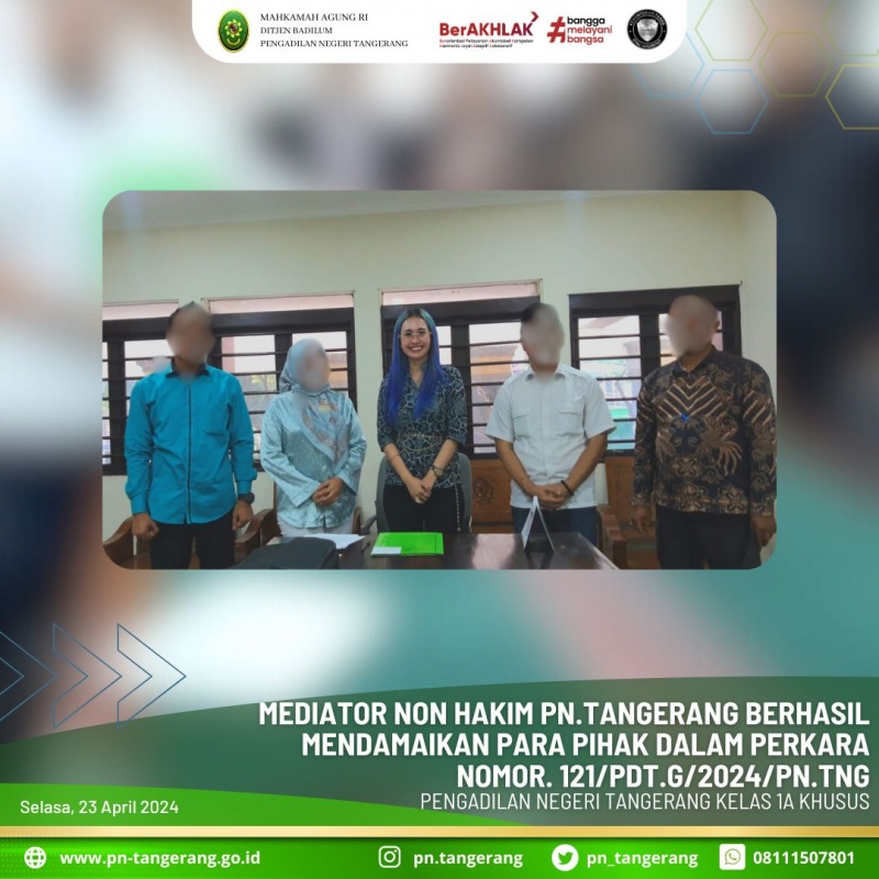 Bertempat di ruang mediasi Pengadilan Negeri Tangerang, Mediator Pengadilan Negeri Tangerang, Ibu Anita Fitra, S.H., M.H., telah berhasil mendamaikan para pihak dalam perkara Perbuatan Melawan Hukum No. 121/Pdt.G/2024/PN.Tng.
