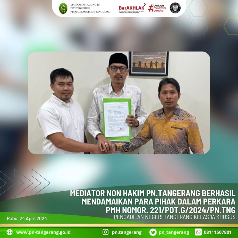 Bertempat di ruang mediasi Pengadilan Negeri Tangerang, Mediator Pengadilan Negeri Tangerang, Bapak. Alfin Putrawan, S.H., CIL., CPM., CPArb., CDBP., CPCLE., CML., CPC., telah berhasil mendamaikan para pihak dalam perkara Perbuatan Melawan Hukum No. 221/Pdt.G/2024/PN.Tng.