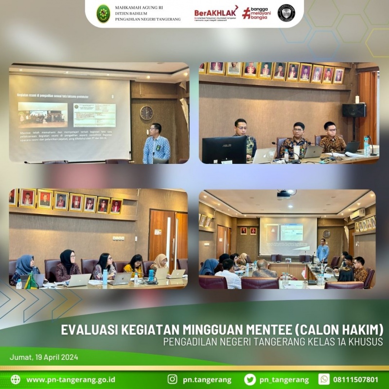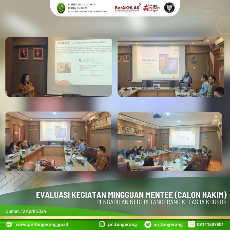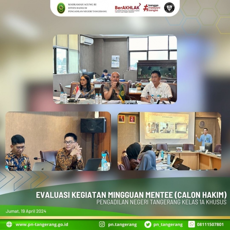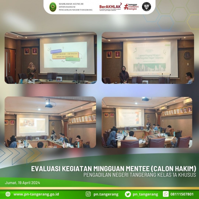 Pada hari ini Jum’at tanggal 19 April 2024 pukul 13.30 WIB s.d 16.00 WIB bertempat di Ruang Rapat Pimpinan Lantai 2 Pengadilan Negeri Tangerang dilaksanakan Evaluasi Kegiatan Mingguan Mentee. Masing-masing Mentee memaparkan kegiatan mingguan mereka dihadapan Para Mentor Hakim yaitu Bapak. Achmad Irfir Rochman, S.H., M.H., Ibu Novita Riama, S.H., M.H., Bapak Kony Hartanto, S.H., M.H., dan dilanjutkan dengan sesi diskusi dan tanya jawab. Pada periode minggu pertama ini (tanggal 16 s.d 19 April 2024) Mentee dibagi melaksanakan kegiatan di bagian kesekretariatan yaitu pada Sub Bagian Umum dan Keuangan. Para mentee diberikan waktu untuk mempresentasikan kegiatan magangnya kemudian hal-hal yang dipresentasikan tersebut ditanggapi oleh Para Mentor dan didiskusikan dengan para Mentee. (lsl).