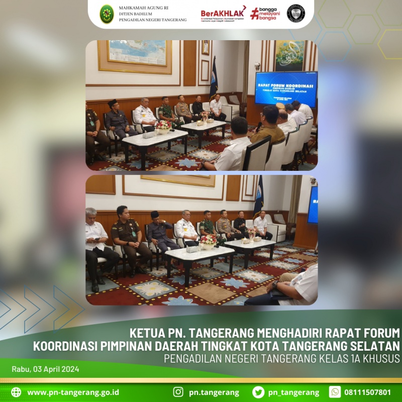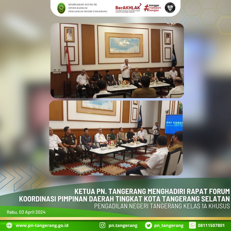 Ketua Pengadilan Negeri Tangerang Kelas 1A khusus Bapak Dr. Fahmiron S.H., M.Hum, menghadiri undangan Rapat Forum Koordinasi Pimpinan Daerah Tingkat Kota Tangerang Selatan berdasarkan surat undangan nomor : 200.1.3/1598/ Kesbangpol/ 2024 tertanggal 28 Maret 2024 dari Walikota Tangerang Selatan, yang berlangsung di Rumah Dinas Wali Kota Tangerang Selatan pada hari rabu ini di mulai dari jam 14.00wib s.d selesai.
