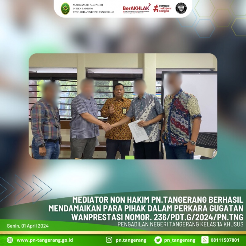 Pada hari 01 April 2024, bertempat di Ruang Mediasi pada Pengadilan Negara Tangerang Kelas 1A Khusus, Bapak Dr. (c).Ali Umar Harahap, S.H., M.H. C.Med., dengan upaya maksimal menjalankan fungsi sebagai Mediator Non Hakim pada Pengadilan Negeri Tangerang Kelas 1A Khusus berhasil mendamaikan para pihak yang bersengketa dalam Gugatan Wanprestasi dengan Perkara Nomor: 236/Pdt.G/2024/PN.Tng, dengan menempuh 2(dua) kali Mediasi akhirnya berakhir dengan damai dan tertuang dalam kesepakatan perdamaian. Selanjutnya akan dilakukan pencabutan gugatan dan dimohonkan kepada Majelis Hakim yang memeriksa, mengadili dan memutus perkara untuk dikuatkan dalam Putusan Perdamaian (Akte van Dading).