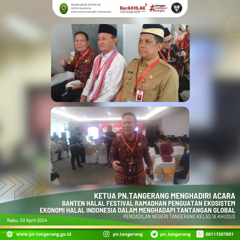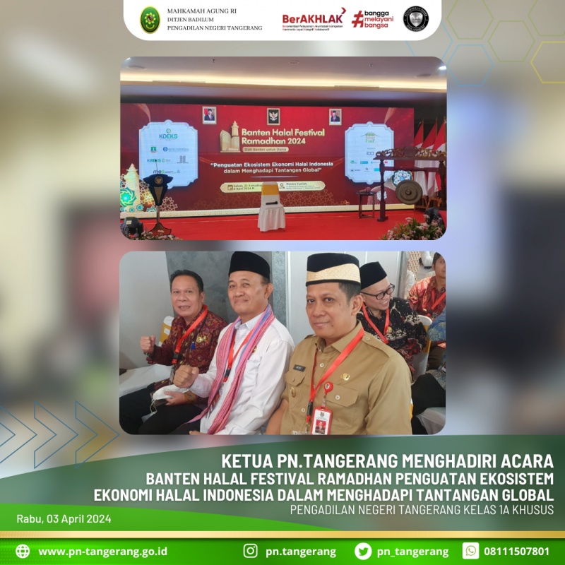 Berdasarkan Surat Undangan, Gubernur Banten bermaksud menyelenggarakan Acara Banten Halal Festival Ramadhan Penguatan Ekosistem Ekonomi Halal Indonesia Dalam Menghadapi Tantangan Global. Maka Selasa 02 April 2024, bertempat di Menara Syariah Pantai Indah Kapuk 2, Kabupaten Tangerang, Provinsi Banten, pukul 13.30 WIB s/d selesai, Ketua Pengadilan Negeri Tangerang Bapak. Dr. Fahmiron, S.H., M.Hum., menghadiri acara tersebut.