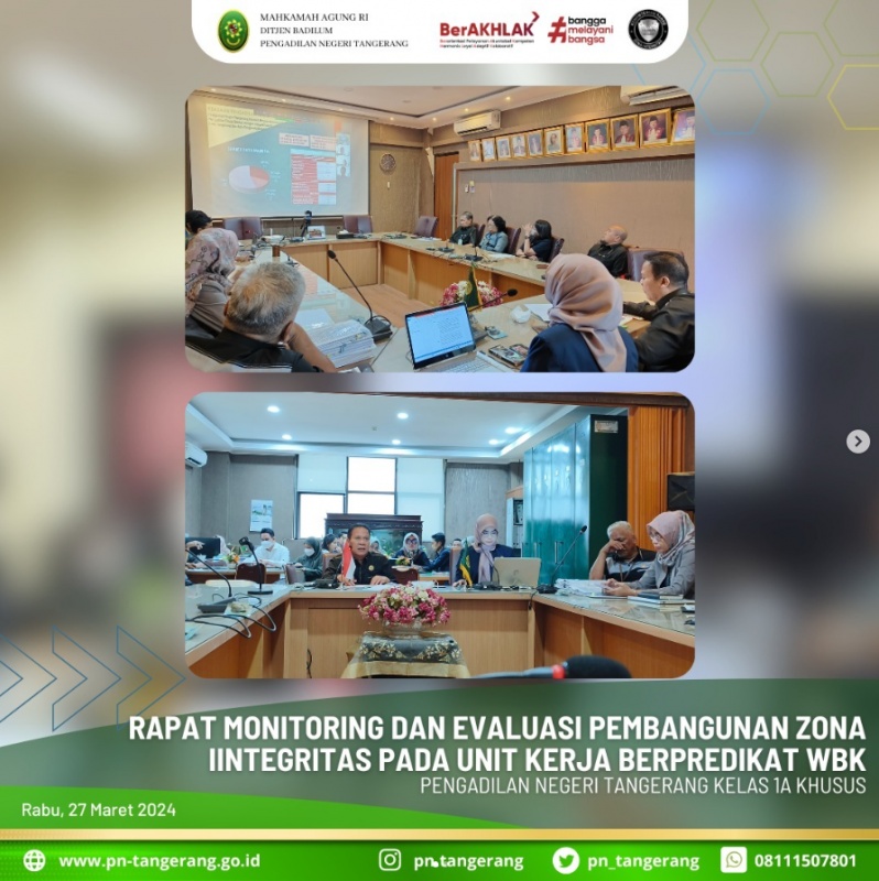 Rapat yang berlangsung secara daring ini berdasarkan surat undangan Nomor : 448/BP/PW.1.1.1/III/2024 tertanggal 18 Maret 2023 dari Badan Pengawas Mahkamah Agung RI berlangsung dari jam 08.30wib s/d 9.30wib, dihadiri Ketua Pengadilan Dr. Fahmiron, S.H., M.Hum., Wakil Ketua Pengadilan Negeri Tangerang Muhammad Alfi Sahrin Usup, S.H., M.H. Para Kordinator area, Operator masing-masing Area, dan Para Pejabat struktural.