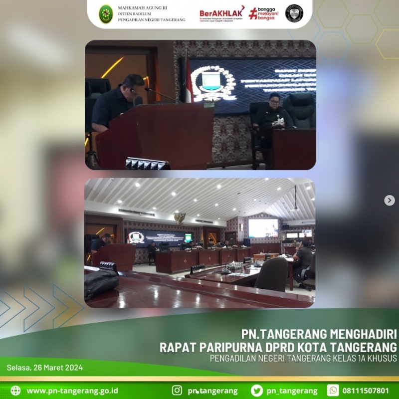Rapat Paripurna dipimpin oleh Ketua DPRD Kota Tangerang, Gatot Wibowo, rapat ini dihadiri oleh para anggota DPRD Kota Tangerang, Sekretaris DPRD Kota Tangerang, serta unsur Forkopimda. Dalam kersempatan ini dihadiri oleh Kepala Sub Bagian Tata Usaha dan Keuangan Pengadilan Negeri Tangerang Bapak H. Bayu Fitrias luhung Bhaskara,S.T.,M.H.