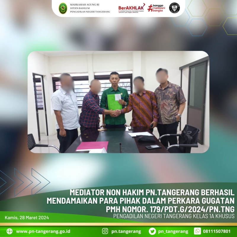 Pada hari Rabu, 27.03.2024 bertempat di Ruang Mediasi pada, Pengadilan Negara Tangerang Kelas 1A Khusus, Bapak Dr.c Edward M. Sihombing.,S.H., M.H., C.Me., dengan upaya maksimal menjalankan fungsi sebagai Mediator Non Hakim pada Pengadilan Negeri Tangerang Kelas 1A Khusus berhasil mendamaikan para pihak yang bersengketa perkara PMH dengan Perkara Nomor: 179/Pdt.G/2024/PN.Tng yang berakhir dengan pencabutan gugatan,Selanjutnya dimohonkan kepada Majelis Hakim yang memeriksa, mengadili dan memutus perkara.