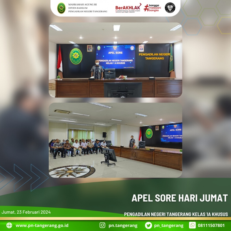 Menutup akhir pekan Pengadilan Negeri Tangerang, melaksanakan apel sore hari jumat yang dipimpin oleh Hakim Bapak RAKHMAN RAJAGUKGUK, S.H., M.Hum., dengan seluruh Pegawai Pengadilan Negeri Tangerang, kegiatan ini dilaksanakan pada hari Jumat, tanggal 16 Februari 2024, pukul 16:00 WIB, yang bertempat di ruang aula lantai 5 Pengadilan Negeri Tangerang. Kegiatan ini sebagai bentuk kesiapan dan kedisiplinan setelah mengakhiri rutinitas kerja sehari-hari. Apel sore juga menjadi wadah pimpinan memberikan penguatan kepada para pegawai melalui pengarahan dan amanat.
