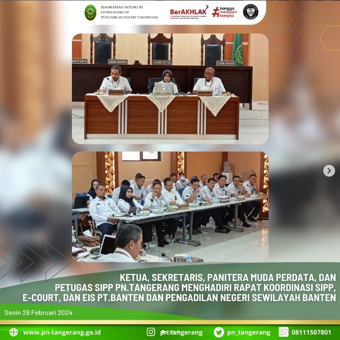 Berdasarkan Surat Undangan Ketua Pengadilan Tinggi Banten Ibu Dr. Andriani Nurdin, S.H., M.H., No.563/KPT.W29-U/UND.DL.1.10/2/II024 tanggal 22 Pebruari 2024 perihal RPt Koordinasi SIPP, E-Court, EIS maka pada hari ini diselenggarakan rapat tersebut yang bertempat di Ruang Sidang Utama Pengadilan Tinggi Banten, Pada Hari Senin, 26 Februari 2024, pukul 09.00 WIB. Ketua Pengadilan Negeri Tangerang Bapak. Dr. Fahmiron, S.H., M.Hum. beserta Sekretaris Bapak H. Zulfikar Arif Rahman Purba, S.H., M.M., Panitera Muda Perdata Ibu Endang Purwaningsih, S.H., M.H., dan Petugas SIPP dan E-Court Pengadilan Negeri Tangerang, menghadiri Rapat Koordinasi tersebut.
