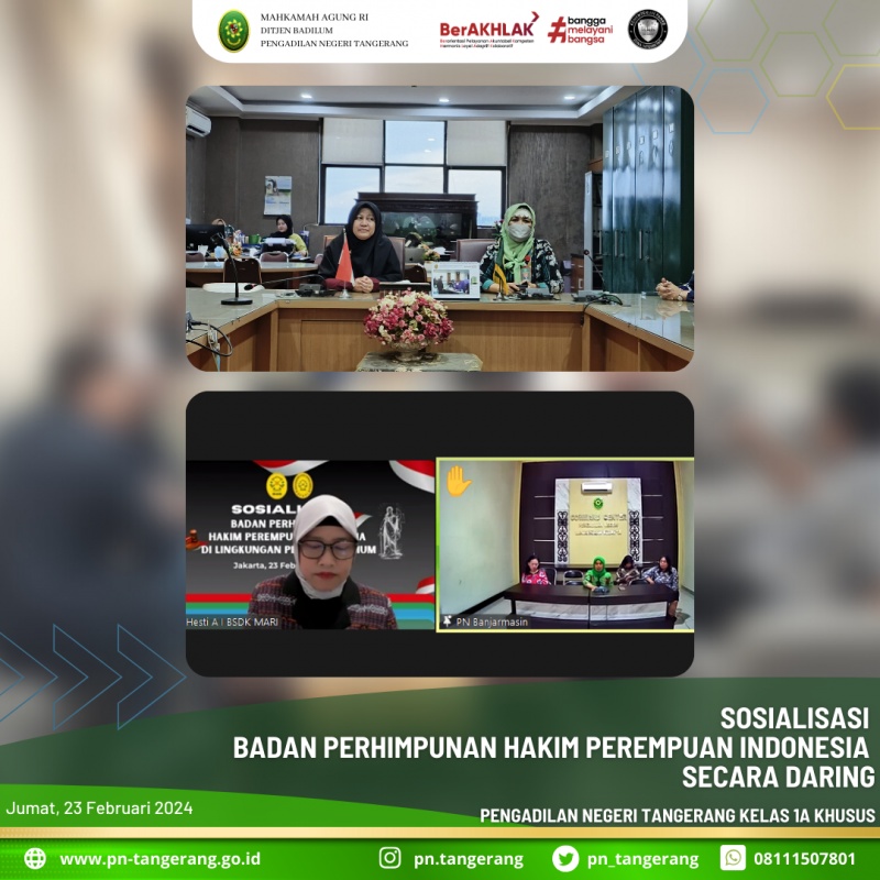 Berdasarkan Surat Dirjen Badilum Nomor: 293/DJU/DL1.10/II/2024, Tanggal 12 Februari 2024, Tentang Sosialisasi Badan Perhimpunan Hakim Perempuan Indonesia dan Menindaklanjuti Surat Badan Perhimpunan Hakim Perempuan Indonesia Nomor: 02/BPHPI-IKAHI/II/2024, Tanggal 07 Februari 2024, maka dilangsungkan kegiatan tersebut pada hari Jumat, 23 Februari 2024, Pukul 08.30-10.30 WIB secara Daring di Ruang Rapat Pimpinan Lt. 2 Gedung Pengadilan Negeri Tangerang dengan dihadiri oleh Para Hakim Perempuan Pengadilan Negeri Tangerang.