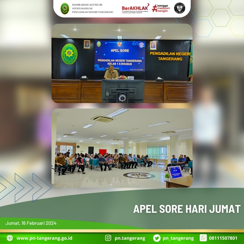 Menutup akhir pekan Pengadilan Negeri Tangerang, melaksanakan apel sore hari jumat yang dipimpin oleh Hakim Bapak. Suprayogi, S.H., M.H., dengan seluruh Pegawai Pengadilan Negeri Tangerang, kegiatan ini dilaksanakan pada hari Jumat, tanggal 16 Februari 2024, pukul 16:00 WIB, yang bertempat di ruang aula lantai 5. Kegiatan ini sebagai bentuk kesiapan dan kedisiplinan setelah mengakhiri rutinitas kerja sehari-hari. Apel sore juga menjadi wadah pimpinan memberikan penguatan kepada para pegawai melalui pengarahan dan amanat.