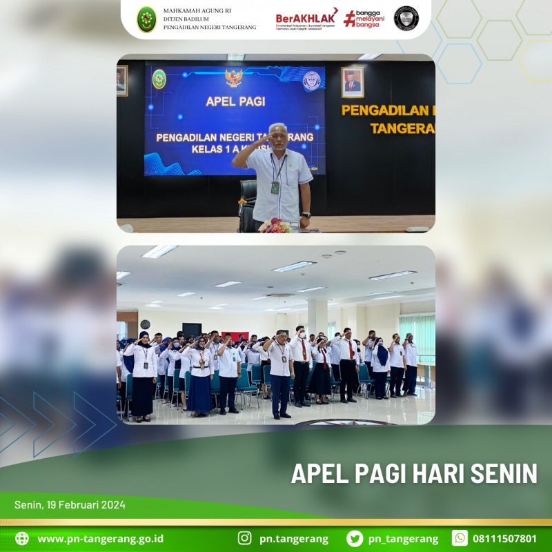 Apel Senin pagi merupakan sebuah tindak lanjut dari upaya penegakan disiplin kerja Aparatur Sipil Negara (ASN), khususnya pegawai di Pengadilan Negeri Tangerang. Selain untuk mendengarkan arahan pimpinan, apel pagi juga bermanfaat untuk melatih disiplin dan tanggung jawab serta evaluasi kegiatan yang berjalan. Maka dari itu Pengadilan Negeri Tangerang melaksanakan apel pagi hari Senin, 19 Februari 2024, di ruang aula lantai 5, diikuti oleh Bapak/Ibu hakim, Panitera, Sekretaris, para pejabat Struktural/Fungsional, serta diikuti oleh seluruh Karyawan/Karyawati ASN, Tenaga Honor dan Tenaga Kerja Kontrak pada Pengadilan Negeri Tangerang.