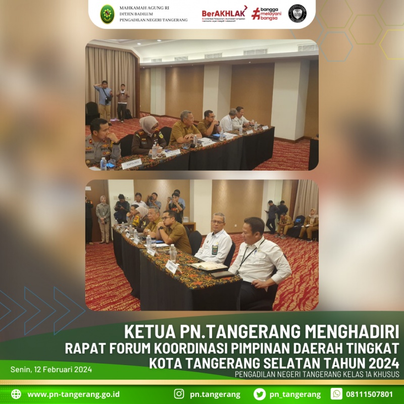 Rapat Forum Koordinasi Pimpinan Daerah Tingkat Kota Tangerang Selatan Tahun 2024, Pada Hari Senin, 12 Februari 2024 pukul 09.00 WIB, Ketua Pengadilan Negeri Tangerang Bapak Dr. Fahmiron, S.H., M.Hum., menghadiri acara tersebut, yang diselenggarakan di Grand Zury Hotel, Lengkong Gudang Kec. Serpong Kota Tangerang Selatan.