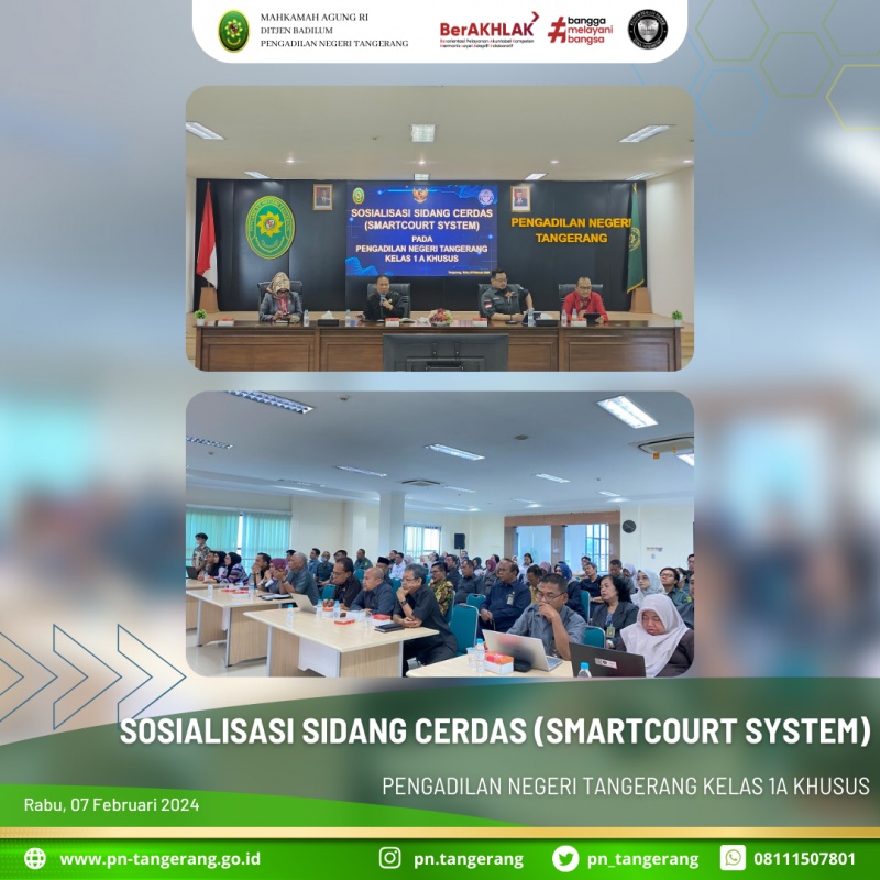 Dalam meningkatkan kinerja seluruh jajaran kepaniteraan khususnya panitera pengganti maka Pengadilan Negeri Tangerang mengadakan kegiatan “Sosialisasi Sidang Cerdas (Smartcourt System)” yang bertempat di Aula lantai 5 pada pukul 09.30 WIB. Kegiatan ini dipimpin oleh Ketua Bapak. Dr. Fahmiron, S.H., M.Hum., didampingi Panitera Ibu Dr. Tantri Yanti Muhammad, S.H., M.H., CLA., dan Anggota pengelola aplikasi sidang cerdas (smartcourt system).