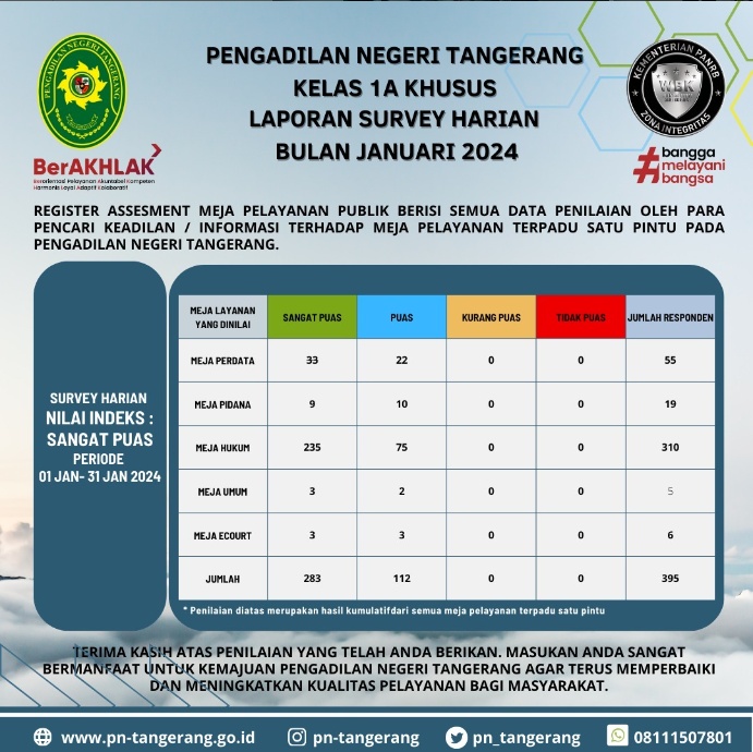 Hari ini admin mau kasih informasi ke kalian mengenai Laporan Survey Harian Pengadilan Negeri Tangerang Bulan Januari Tahun 2024 Periode 01 Januari – 31 Januari 2024 dengan Nilai Indeks SANGAT PUAS !!!