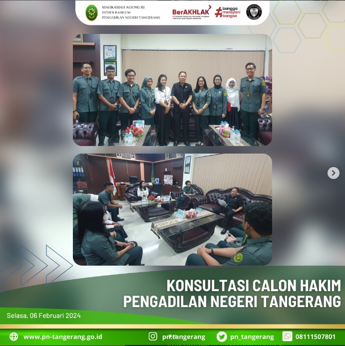 Pada hari Selasa 26 Januari 2024, pukul 11.00, bertempat di ruang Ketua Pengadilan Negeri Tangerang, Bapak. Dr. Fahmiron, S.H., M.Hum., menerima calon – calon hakim magang di Pengadilan Negeri Tangerang yang melakukan konsultasi mengenai jadwal Program Diklat PPC Hakim Terpadu.
