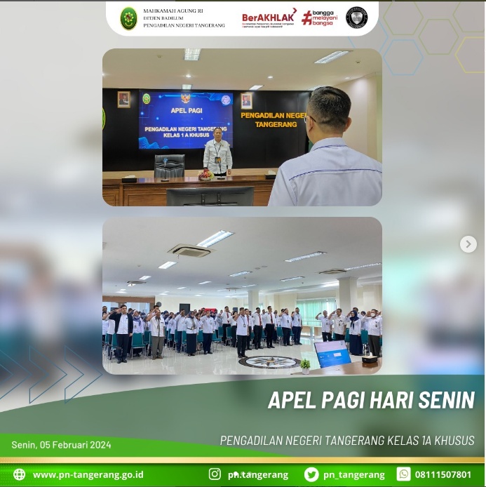 Apel pagi dilaksanakan pada Senin, 05 Februari 2024, Pukul 08.00 WIB, di Ruang Aula Lantai 5. Apel pagi ini diikuti oleh Wakil Ketua, Bapak/Ibu Hakim, Panitera, Sekretaris, para pejabat Struktural/Fungsional, serta diikuti oleh seluruh Karyawan/Karyawati ASN, Tenaga Honor dan Tenaga Kerja Kontrak pada Pengadilan Negeri Tangerang.