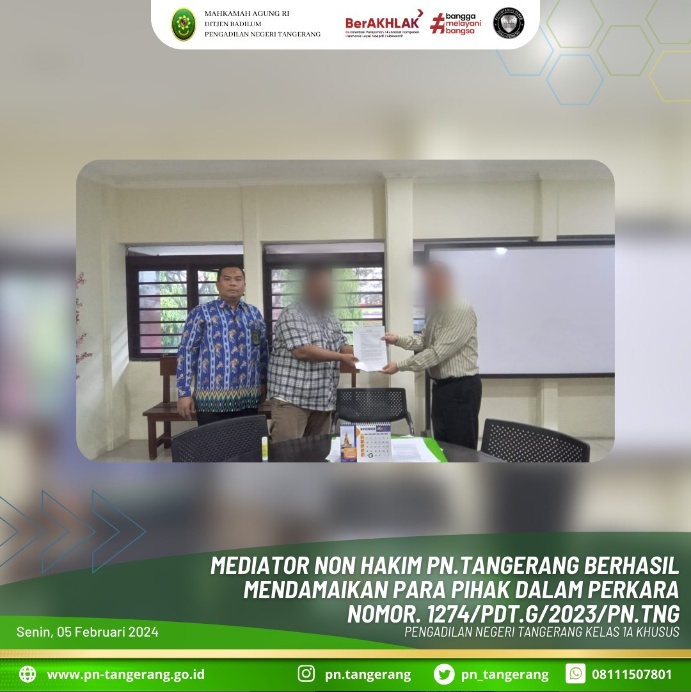 Mediasi adalah salah satu bentuk alternatif penyelesaian sengketa yang diatur dalam Perma No. 1 Tahun 2016 tentang Prosedur Mediasi di Pengadilan. Pada hari, Senin (05/02/2024) adalah hari yang berbahagia untuk Penggugat dan Tergugat dalam perkara nomor 1274/Pdt.G/2023/PN.Tng dalam gugatan perbuatan melawan hukum, dapat berakhir dan berhasil damai dengan menempuh 3 (tiga) kali agenda Mediasi di Pengadilan Negeri Tangerang, Penggugat melalui Kuasa Hukumnya sudah mengajukan permohonan pencabutan gugatan kepada MAJELIS HAKIM. yang dibantu dirumuskan oleh Mediator Non-Hakim PN Tangerang, Bapak Dr. (c).Ali Umar Harahap, S.H., M.H. C.Me.