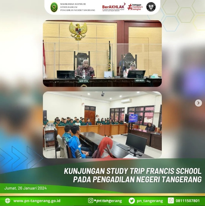Ini adalah kali pertama Sekolah Francis School berkunjung ke Pengadilan Negeri Tangerang. Kegiatan ini dalam rangka study trip atau kunjungan lapangan siswa-siswi untuk mempelajari sistem peradilan di Indonesia sebagai salah satu materi dalam PPKn (Pendidikan Pancasila dan Kewarganegaraan).