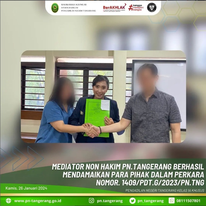 Mediasi adalah salah satu bentuk alternatif penyelesaian sengketa yang diatur dalam Perma No. 1 Tahun 2016 tentang Prosedur Mediasi di Pengadilan. Pada hari, Kamis (25/01/2024) adalah hari yang berbahagia untuk Penggugat dan Tergugat dalam perkara nomor 1409/Pdt.G/2023/PN.Tng dalam gugatan tentang Gono gini, dapat berakhir dan berhasil damai dengan menempuh 3 (tiga) kali agenda Mediasi di Pengadilan Negeri Tangerang, yang dibantu dirumuskan oleh Mediator Non-Hakim PN Tangerang, Ibu Kristin Julita Prieny, SH.,CTL., CMe.