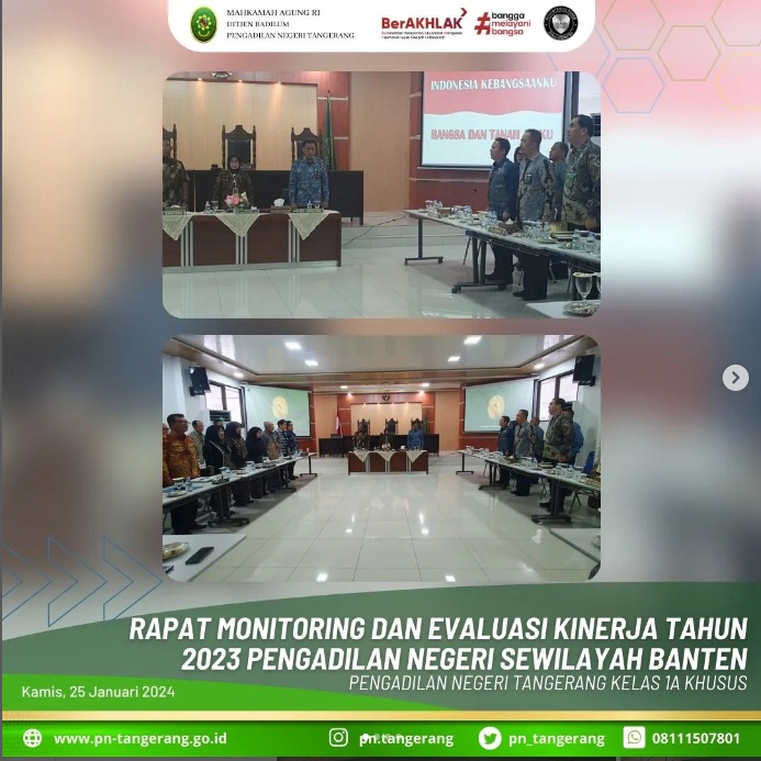 Ketua Pengadilan Tinggi Banten, Ibu Dr. Andriani Nurdin,SH., MH. mengumpulkan para Ketua, Wakil Ketua, Panitera, dan Sekretaris Pengadilan Negeri sewilayah Banten pada Pengadilan Tinggi Banten dalam forum rapat monitoring dan evaluasi, yang dilaksanakan pada Hari Kamis, tanggal 25 Januari 2024, bertempat di Ruang Aula Pengadilan Tinggi Banten.