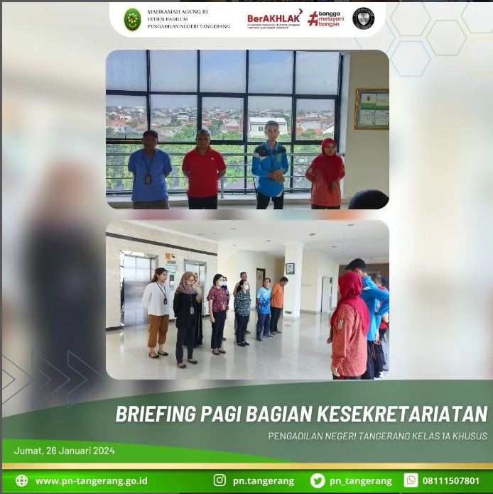 Briefing dipimpin langsung oleh Bapak H. Zulfikar Arif Rahman Purba, S.H., M.M., selaku Sekretaris Pengadilan Negeri Tangerang. Didampingi oleh Kasubbag TUK, Kasubbag Kepegawaian dan Ortala, dan PLT Kasubbag PTIP, serta dihadiri oleh seluruh Tim Kesekretariatan pada Pengadilan Negeri Tangerang. Briefing dimulai tepat pukul 07.35 WIB dan selesai 08:00 WIB.