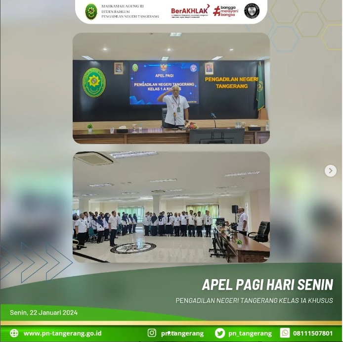 Apel pagi dilaksanakan pada Senin, 22 Januari 2024, Pukul 08.00 WIB, di Ruang Aula Lantai 5. Peserta apel pagi ini diikuti oleh Ketua, Bapak/Ibu hakim, Panitera, Sekretaris, para pejabat Struktural/Fungsional, serta diikuti oleh seluruh Karyawan/Karyawati ASN, Tenaga Honor dan Tenaga Kerja Kontrak pada Pengadilan Negeri Tangerang.