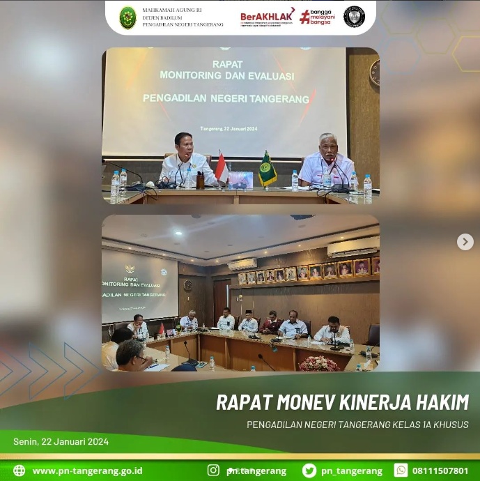 Dalam meningkatkan kinerja hakim maka Pengadilan Negeri Tangerang mengadakan kegiatan “Rapat Monev Kinerja Hakim” yang bertempat di Ruang Rapat Pimpinan Lantai 2 pada pukul 10.00 WIB. Kegiatan ini dipimpin oleh Ketua Bapak. Dr. Fahmiron, S.H., M.Hum., didampingi Wakil Ketua Bapak. H. Muhammad Alfi Sahrin Usup, S.H., M.H., dan diikuti oleh seluruh Bapak/Ibu Hakim Pengadilan Negeri Tangerang.
