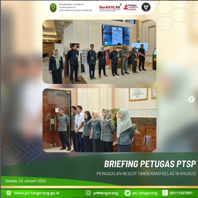 Pada tanggal 23 Januari 2024, bertempat di Ruang PTSP Pengadilan Negeri Tangerang Wakil Ketua Bapak. H. Muhammad Alfi Sahrin Usup, S.H., M.H., memimpin briefing serta memonitoring dan Evaluasi Kinerja Petugas PTSP, didampingi oleh Panitera, Sekretaris, kabag umum, para Panitera Muda, dan Kasubag TUK, serta diikuti seluruh petugas PTSP Pengadilan Negeri Tangerang.