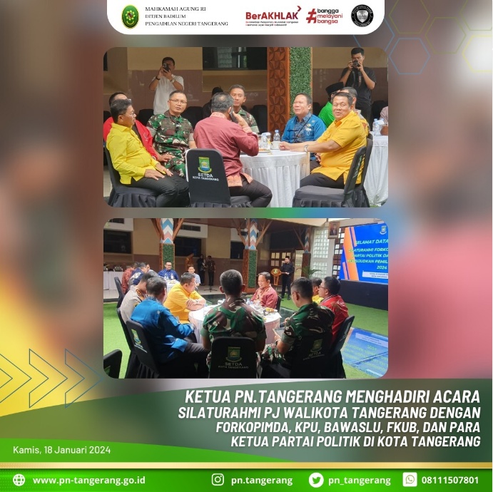 Ketua Pengadilan Negeri Tangerang Dr. Fahmiron, S.H., M.Hum., menghadiri silahturahmi tersebut pada hari Kamis, 18 Januari 2024, pukul 10.00 WIB s/d Selesai guna evaluasi dan monitoring serta sinergitas Forkopimda dalam persiapan pelaksanaan pemilu dan pilkada di Kota Tangerang. (lsl).