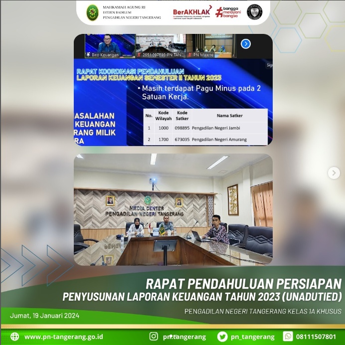 Sehubungan Persiapan Penyusunan Laporan Keuangan Mahkamah Agung RI Tahun 2023 dan Pemeriksaan Badan Pemeriksaan Keuangan (BPK) atas Laporan Keuangan Mahkamah Agung RI guna memperoleh opini Wajar Tanpa Pengecualian (WTP), Badan Urusan Administrasi Mahkamah Agung R.I mengadakan Kegiatan Rapat Pendahuluan Persiapan Penyusunan Laporan Keuangan Mahkamah Agung Tahun 2023 (Unaudited) secara virtual (zoom meeting) pada hari Jumat, 19 Januari 2023 dengan Badan Peradilan yang berada di bawahnya. Bertempat di Ruang Media Center Lantai 5 Pengadilan Negeri Tangerang, Sekretaris Bapak H. Zulfikar Arif Rahman Purba, S.H., M.M., mengikuti acara tersebut dan didampingi juga oleh Kepala Bagian Umum Ibu Dessy Herliani, S.Sos., serta Kepala Sub Bagian Tata Usaha dan Keuangan Bapak H. Bayu Fitrias Luhung Bhaskara, S.T., M.H.