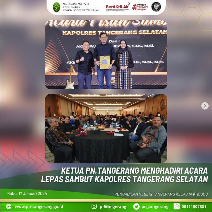 Ketua Pengadilan Negeri Tangerang Dr. Fahmiron, S.H., M.Hum., juga mengucapkan terima kasih dan apresiasi yang setinggi tingginya kepada Bapak Faisal Febrianto atas kerjasama yang luar biasa terhadap Pengadilan Negeri Tangerang selama menjabat Kapolres Kota Tangerang Selatan.