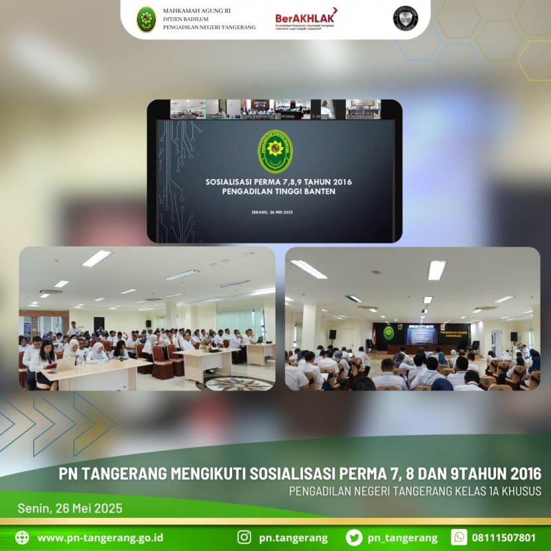 Berdasarkan Surat KPT Banten No. 1391/KPT.W29-U/UND.DL1.10/V/2025, Tanggal 22 Mei 2025, Tentang Undangan Sosialisasi Perma 7, 8 dan Tahun 2016, segenap Keluarga Besar Pengadilan Negeri Tangerang mengikuti kegiatan Sosialisasi tersebut secara daring (zoom meeting) yang bertempat di Ruang Aula Lt.5 Gedung PN Tangerang pada pukul 08.30 WIB s/d Selesai.