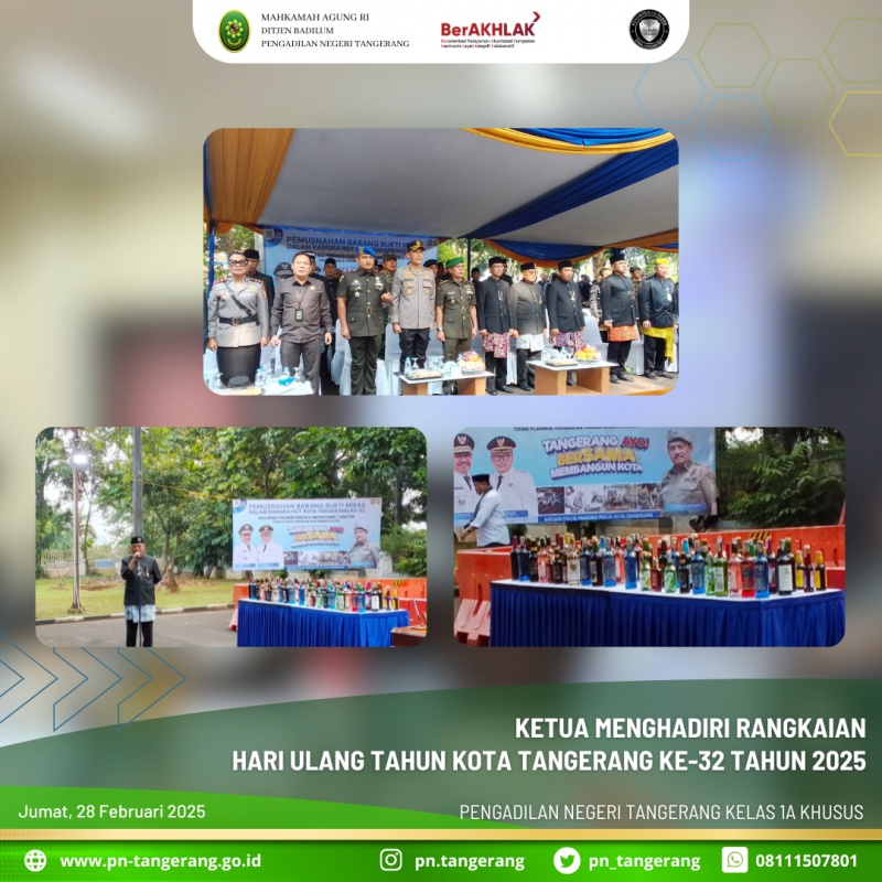 Ketua PN Tangerang, Fahmiron hadir dalam rangkaian perayaan Hari Ulang Tahun (HUT) Kota Tangerang yang ke-32 tahun 2025. Dalam acara yang dihadiri oleh berbagai unsur pemerintahan dan masyarakat ini bertemakan “Kolaborasi Menuju Kota Maju & Berdaya Saing”. Kegiatan yang dilaksanakan di dua tempat dengan agenda Pemusnahan Miras di Pusat Pemerintah Kota Tangerang pada pukul 08.00 WIB dan Rapat Paripurna HUT Ke-32 Kota Tangerang di Ruang Rapat DPRD Kota Tangerang pada pukul 09.00 WIB.